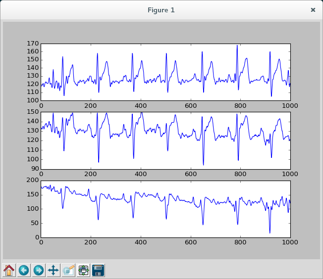 Da das EKG Gerät auf Standardlogikbausteinen basiert ist das Protokoll extrem einfach. Nacheinander werden vier Bytes übertragen, und dann wird der nächste Satz Werte übertragen. Die vier Bytes enthalten die drei Werte der drei Kanäle, und einmal konstant (circa?) den Wert 127 um zuordnen zu können wann ein neues Viererpaket beginnt.