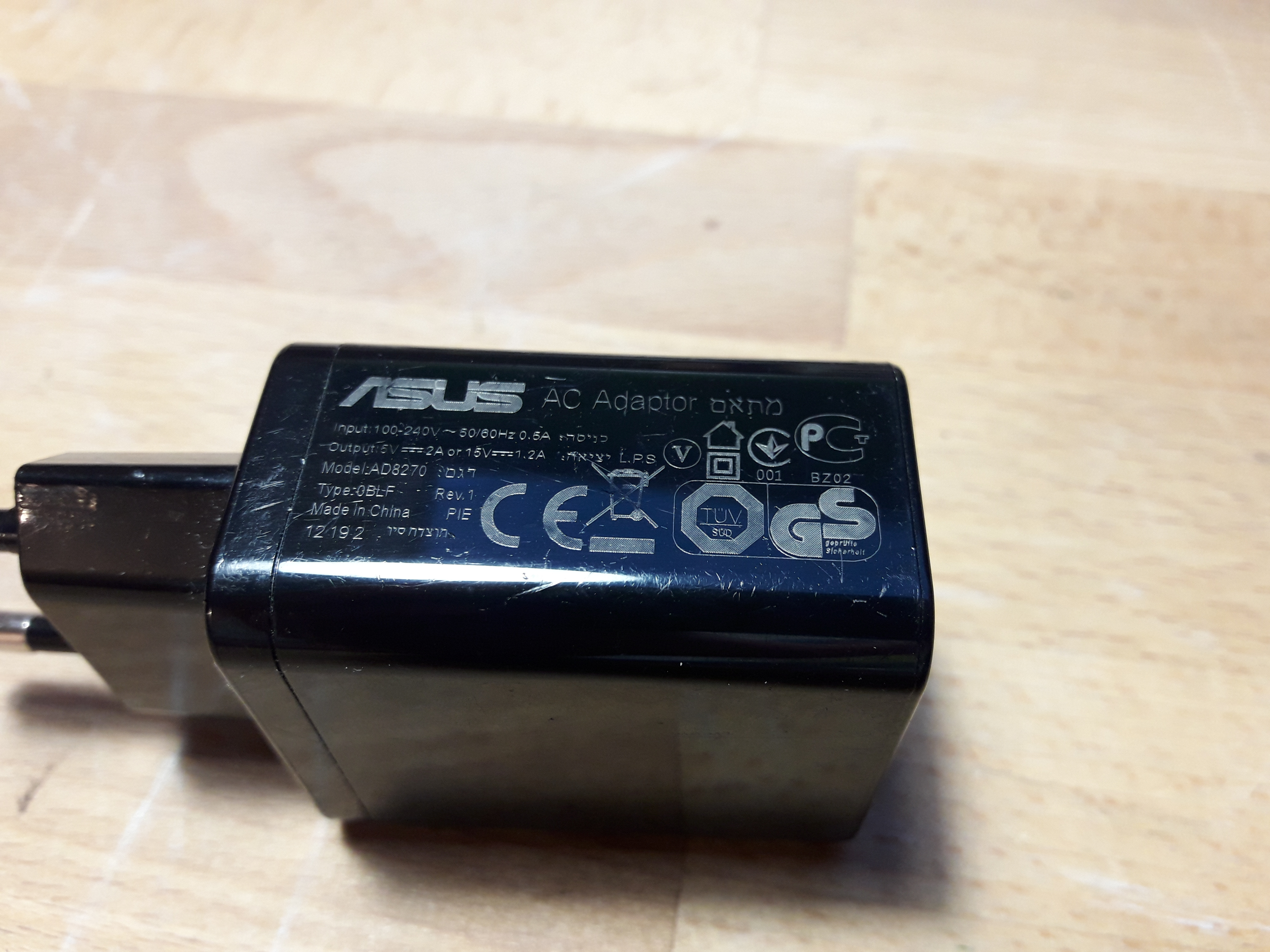 Wie man sieht kann das Asus Netzteil wahlweise bis zu 2A bei 5V oder 1,2A bei 15V liefern. Die \(15V\cdot1,2A=18W\) sind offensichtlich notwendig da mit den \(5V\cdot0,5A=2,5W\) welche die USB2.0 Spezifikation vorsieht ein Tablet mit 10” Bildschirmdiagonale nicht zu betreiben wäre.