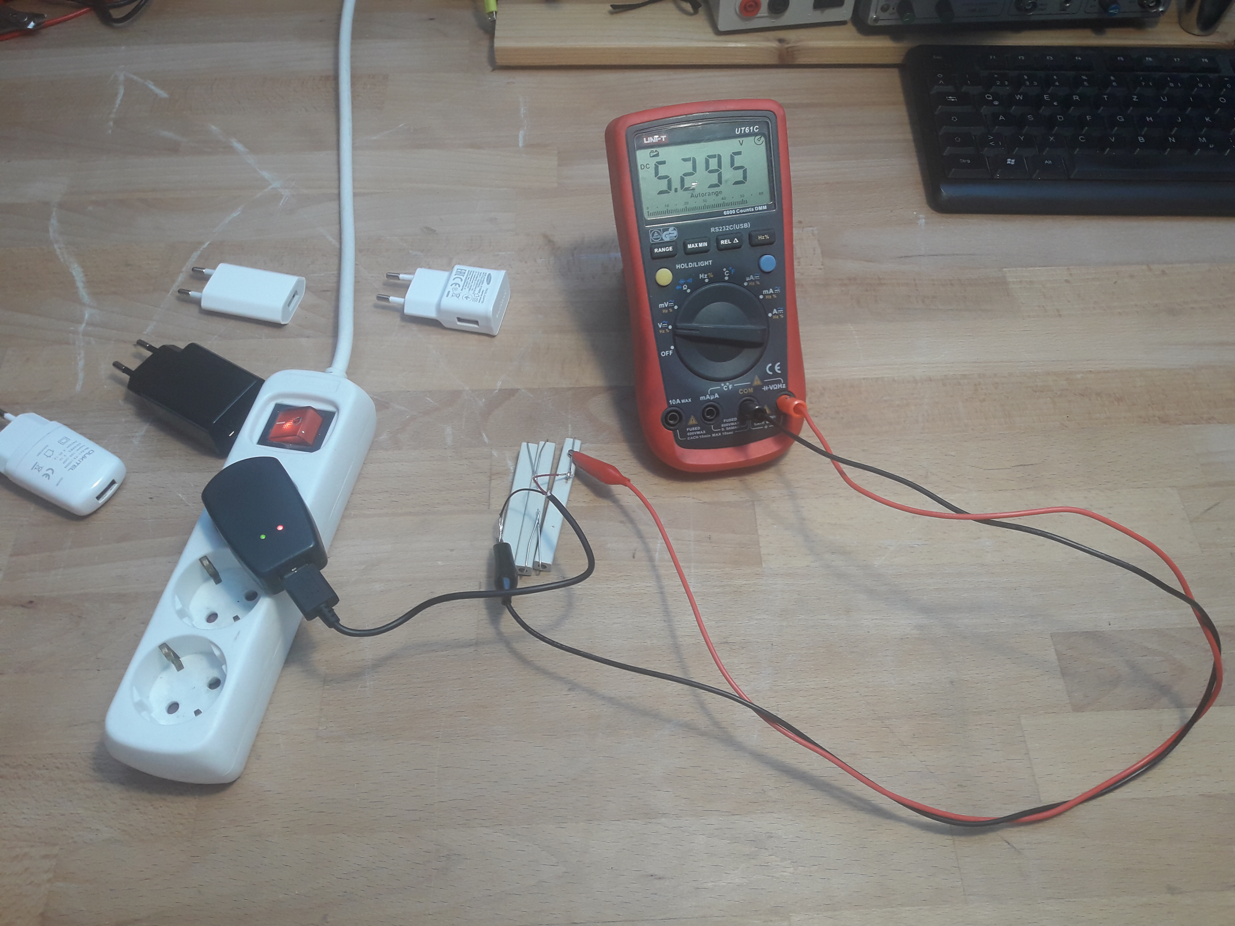 Wenn ich schon mit Messen anfange, dann teste ich auch gleich noch die Effizienz der Netzteile. Dazu werden sie mit einem Widerstand belastet. 100% Leistung entsprechen laut der USB2.0 Spezifikation einem Strom von 500mA bei 5V.