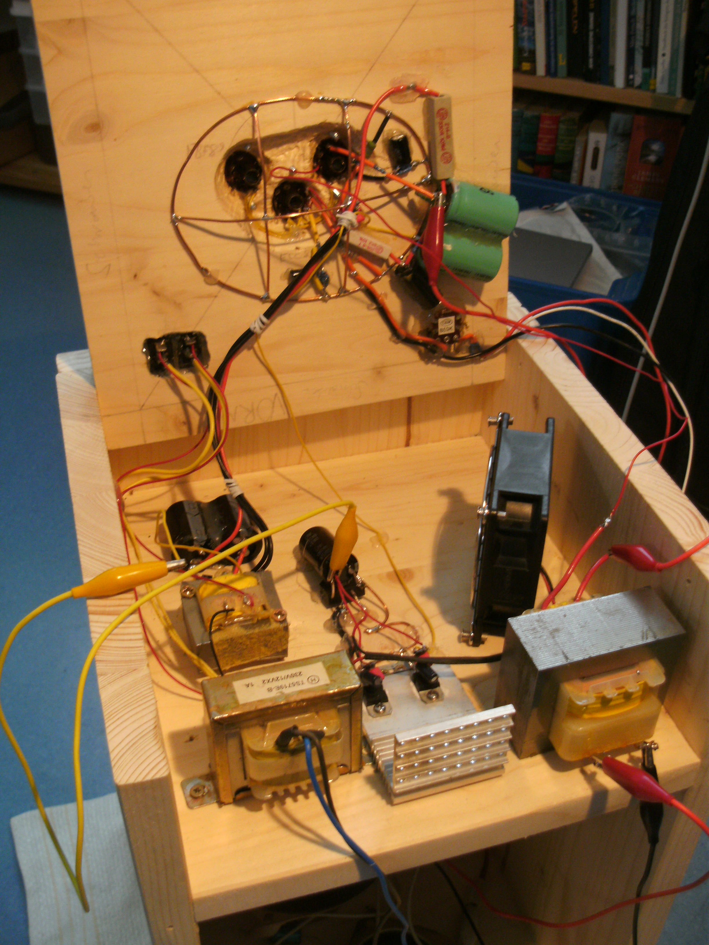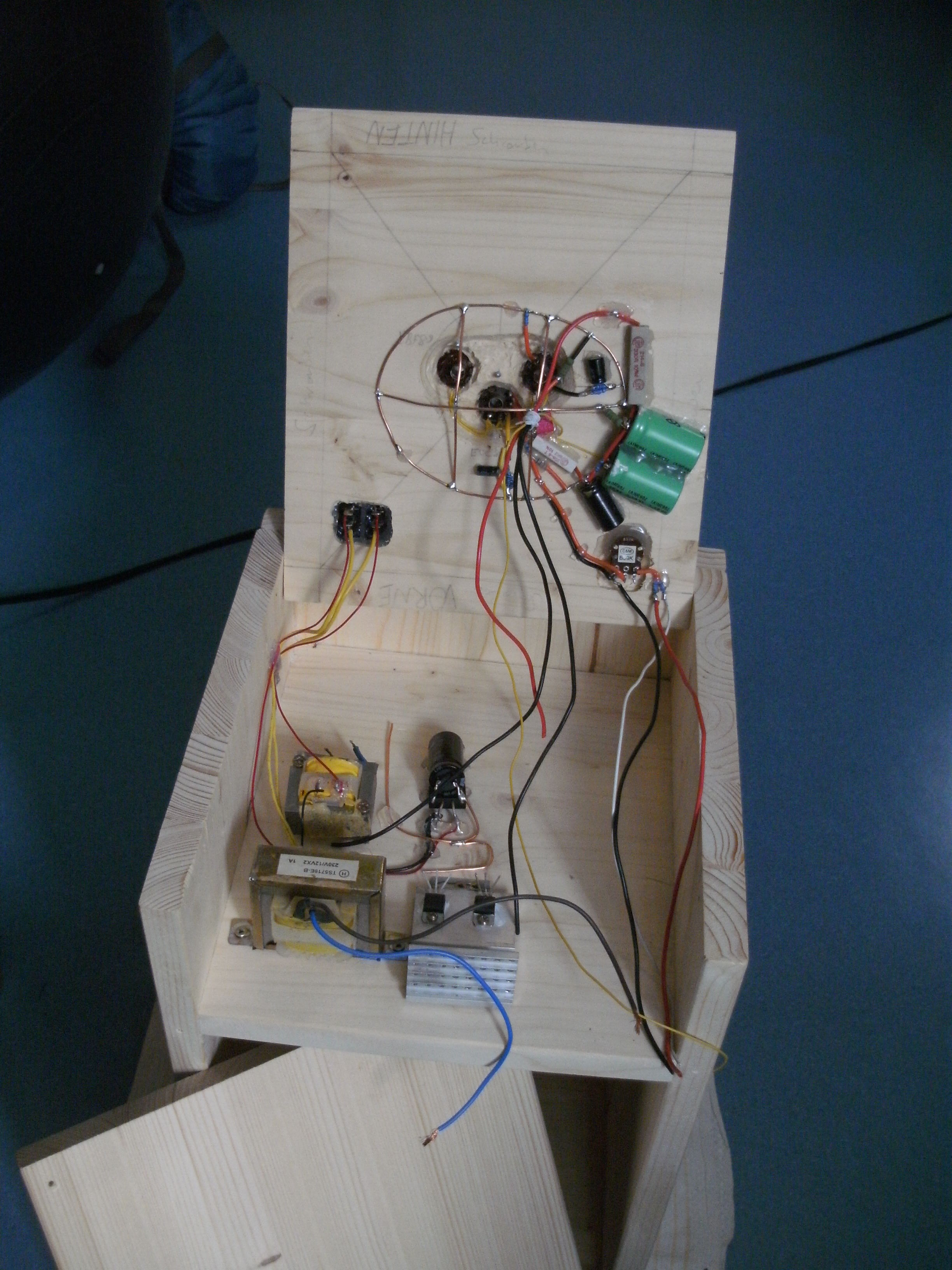 Verstärkt hat das ganze, sogar erstaunlich laut. Aber durch die überhitzenden Trafos, vor allem in Kombination mit dem vielen Holz, ist nicht unwahrscheinlich dass das ganze bei etwas längerer Benutzung in einem Lagerfeuer endet. Der Klang war nicht gut, aber da ist sicher noch viel Raum nach oben. Insbesondere wenn man da ein bisschen gegenkoppelt, und ein Netzteil verwendet welches mit der Last klarkommt. Das Projekt hat aber gezeigt dass es gar nicht so schwer ist einen Röhrenverstärker zu bauen. Und dass man mit den “nur” 12W Anodenleistung einiges an Krach machen kann. Außerdem habe ich einiges über die Dos und Don’ts des Verstärkerbaus gelernt. Hierfür vielen Dank an die Leute aus dem Hifi-Forum.