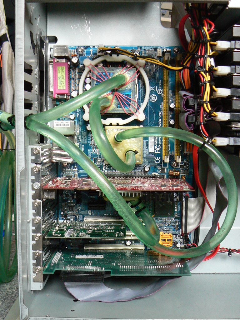 Ich hab mal darüber nachgedacht was so ein Wasserkühler überhaupt ist, nämlich einfach ein kleiner von Wasser durchströmter Kühlkörper (natürlich ohne Lüfter). Inzwischen habe ich zwar herausgefunden das die komerziellen Kühler meistens auf einem anderem Prinzip (Düsenkuehler) aufbauen, allerdings funktionieren diese auch nicht viel besser. Dann habe ich das ganze einfach mal Zusammengebaut und ausprobiert und das Ergebnis war genial! Obwohl ich keinen Radiator eingebaut hatte war der Prozessor im Leerlauf bei etwa 30°C und unter Vollast bei etwa 40°C so kühl war mein Pentium IV vorher nie. Mit einem Luftkühler war er im Leerlauf bei 45°C und unter Last ging er bis auf 60°C hoch. Es lohnt sich also. Das die Geräusche der Lüfter auf Northbridge, Grafikkarte und CPU wegfallen ist natürlich auch ein großer Vorteil.